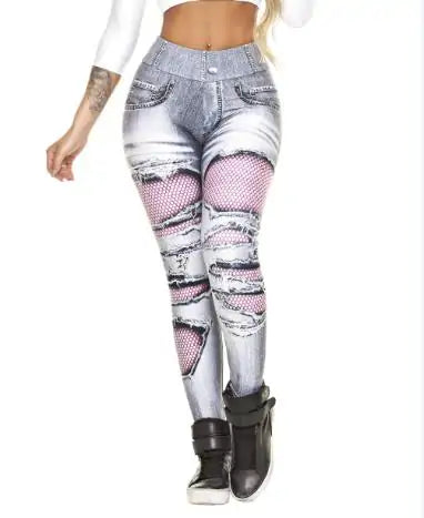 Rock Your Style with Ripped Jeans Print Push Up Leggings