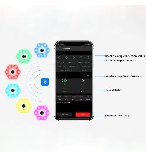 Overview: Reaction Training Lamp is a high-tech, mobile-controlled system designed to improve reaction speed, memory, and spatial awareness. The lamps connect through Bluetooth and offer ultra-precise reaction timing with an accuracy of 0.01 seconds. They can be used independently or in combination, supporting various sensor modes such as touch, vibration, and proximity detection.